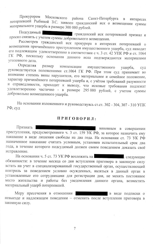 Суд приговорил подсудимого к 2 годам лишения свободы условно с испытательным сроком 2 года. Обязанности: встать на учёт в УИИ, являться на регистрацию, не менять место жительства без уведомления, возместить оставшийся ущерб. Гражданский иск удовлетворён частично — взыскано 295 000 рублей. Подзащитный не поехал в колонию, сохранил работу и семью.