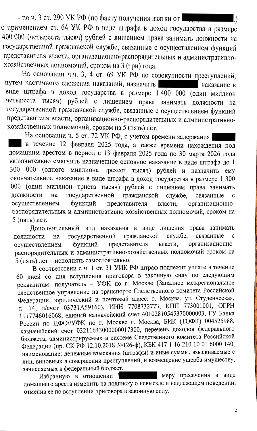 - По совокупности преступлений окончательное наказание — штраф в размере чуть более 1 миллиона рублей и лишение права занимать должности на государственной службе на срок 5 лет.